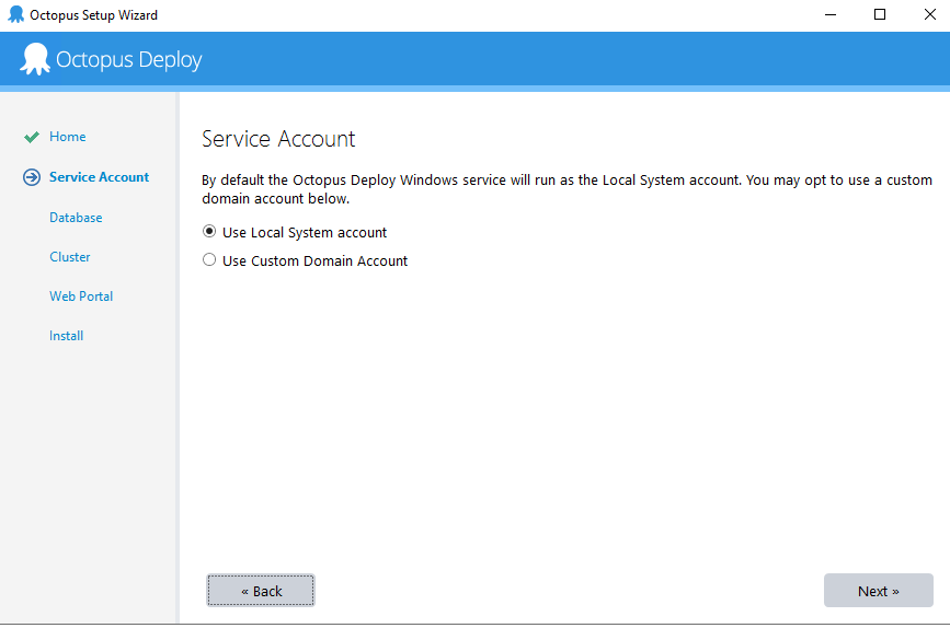Since we’re not using custom Service Accounts, please select the Local System Account for the Octopus service as this is a highly privileged account that’s able to run Octopus: