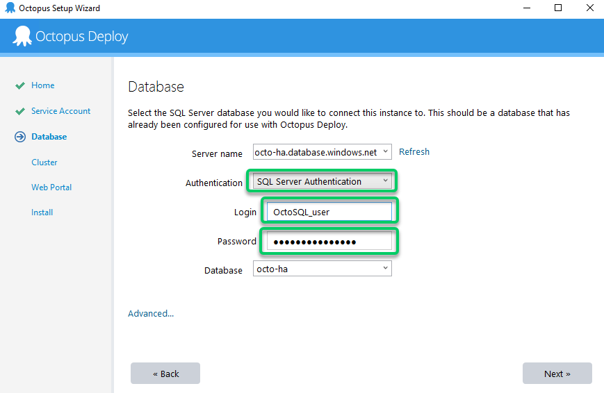 "C:\Program Files\Octopus Deploy\Octopus\Octopus.Server.exe" database --instance "Default" --masterKey "MASTER_KEY" --connectionString "Data Source=octopus-server-ha-db;Initial Catalog=OctopusDeploy-OctopusServer;Integrated Security=False;User ID=admin;Password=MY_PASSWORD"