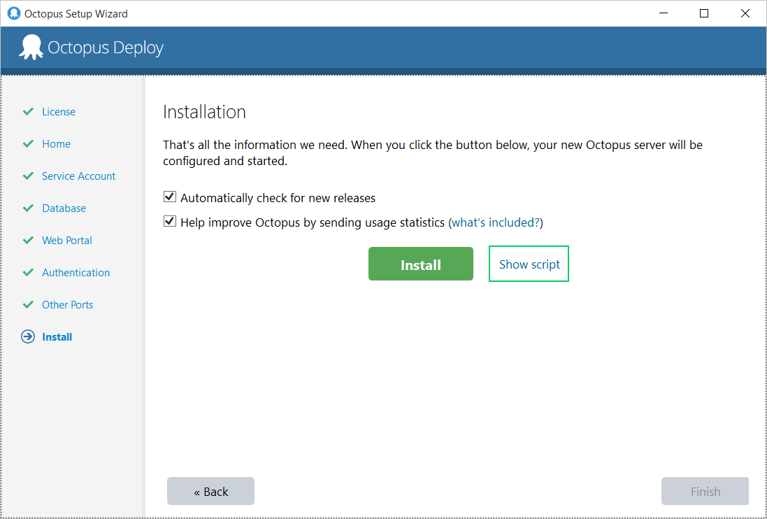 All wizards that you follow in the Octopus or Tentacle Manager provide the ability to export a command-line script of the actions taken. This can be done with the Show Script option at the end of every wizard: