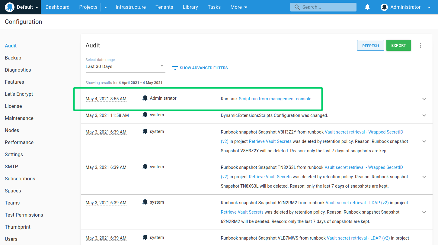 Besides making it easy to run a script on many servers, the other advantage of using the Script Console is auditing. Ad-hoc scripts run via the Script Console will appear in the Audit tab in the Configuration area.