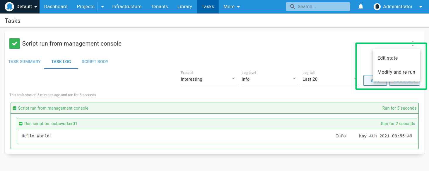 When you run the script, you’ll be taken to the task output page which shows the progress and any output from the script: