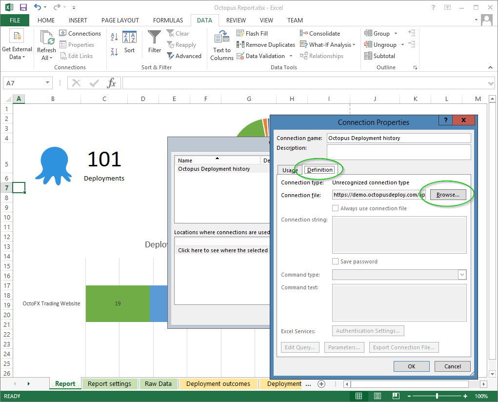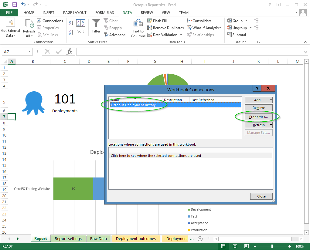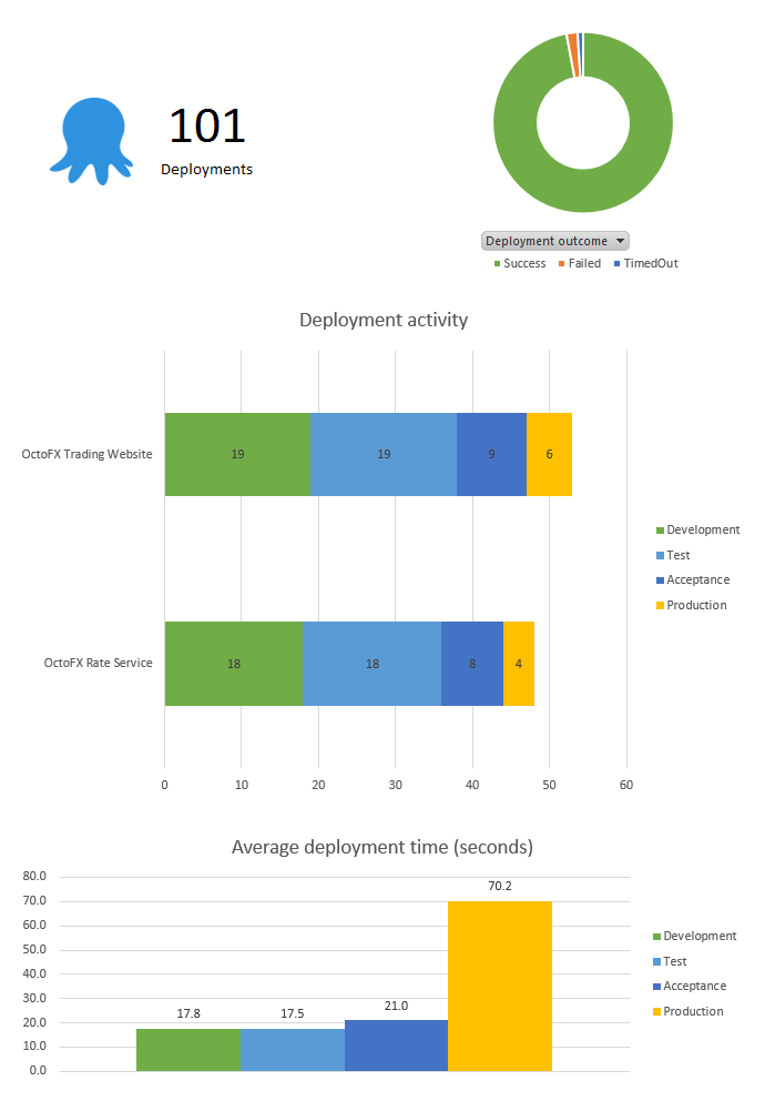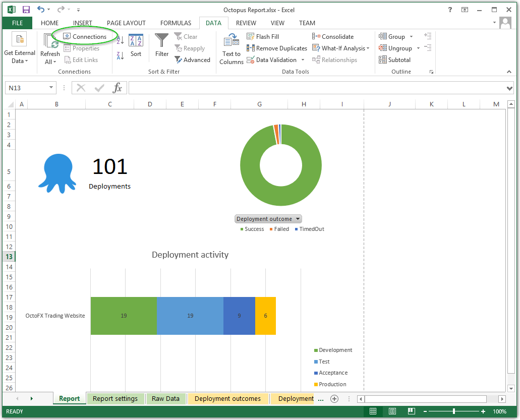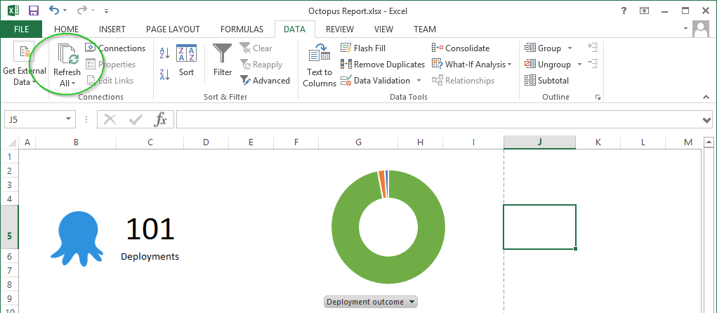To help you get started, we provide a sample Excel spreadsheet that you can connect to your own Octopus Server.