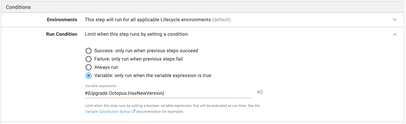 Upgrade.Octopus.Url- the URL of your instance, for examplehttps://samples.octopus.app.Upgrade.Octopus.ApiKey- the API key of a service account with permissions to turn on and off maintenance mode. Please be sure to make this a sensitive variable!Upgrade.Download.Folder- The network location of the shared folder to download the MSI to, for example\\YOUR-NAS\ShareNameUpgrade.Database.Backup.Folder- The network location of the shared folder to backup the database to, for example\\YOUR-NAS\DatabaseBackupShareUpgrade.Database.Name- The name of your Octopus Deploy database. This is used for the backup script.Upgrade.File.Backup.Folder- The folder name to store the file backups in. For example\\YOUR-NAS\FileBackupShareUpgrade.Octopus.HasNewVersion- Output variable set in the first step. All other steps will use this variable as a run condition. Example value:#{unless Octopus.Deployment.Error}#{Octopus.Action[Check for new Octopus Version to Download].Output.UpgradeFound}#{/unless}Upgrade.Download.Msi- Output variable storing the MSI name that is being downloaded. Example value:#{Octopus.Action[Check for new Octopus Version to Download].Output.MSIToDownload}