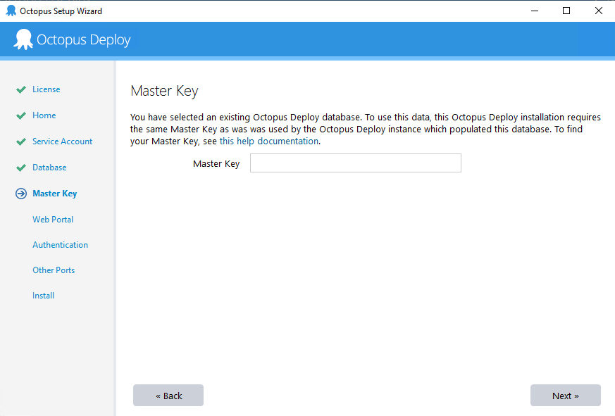 Run the MSI you downloaded to install Octopus Deploy. Once the MSI is finished, the Octopus Manager will automatically launch. Follow the wizard, and on the section where you configure the database, select the pre-existing database.