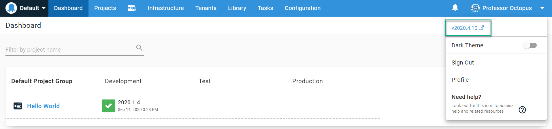 Migrating data from Octopus to a test instance requires both the main instance and test instance to be on the same version. You can find the version you are running by clicking on your name in the top right corner of your Octopus Deploy instance.