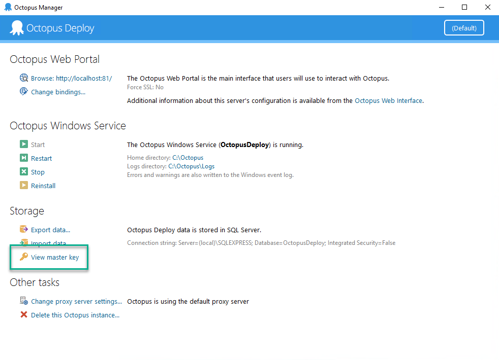 To view the Master Key, you will need login permissions on the server hosting Octopus Deploy. Once logged in, open up the Octopus Manager and click the view master key button on the left menu.