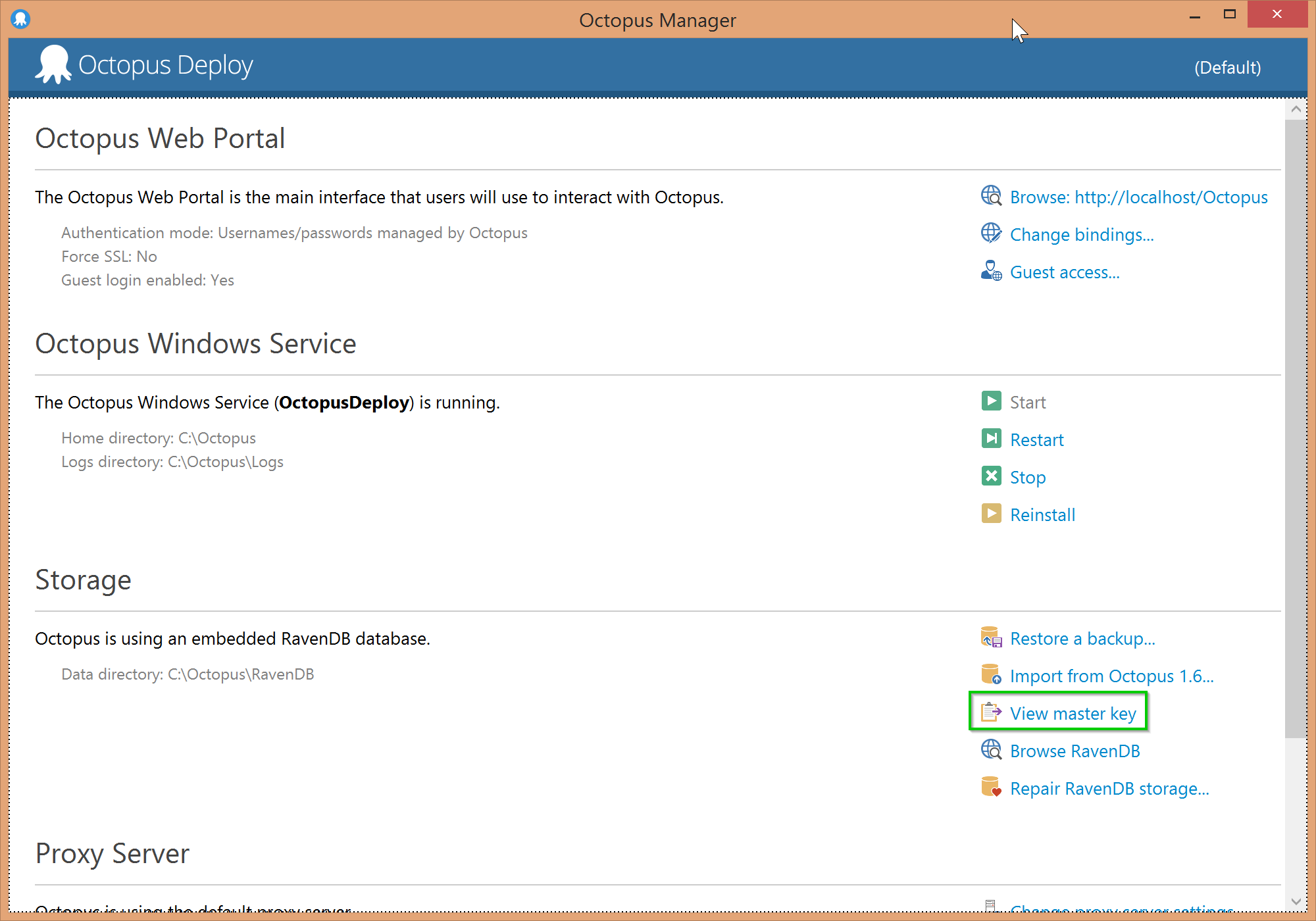 When Octopus is installed, it generates a random string which will be used as the Master Key. You will need to know your Master Key if you ever hope to restore an Octopus backup on another server.