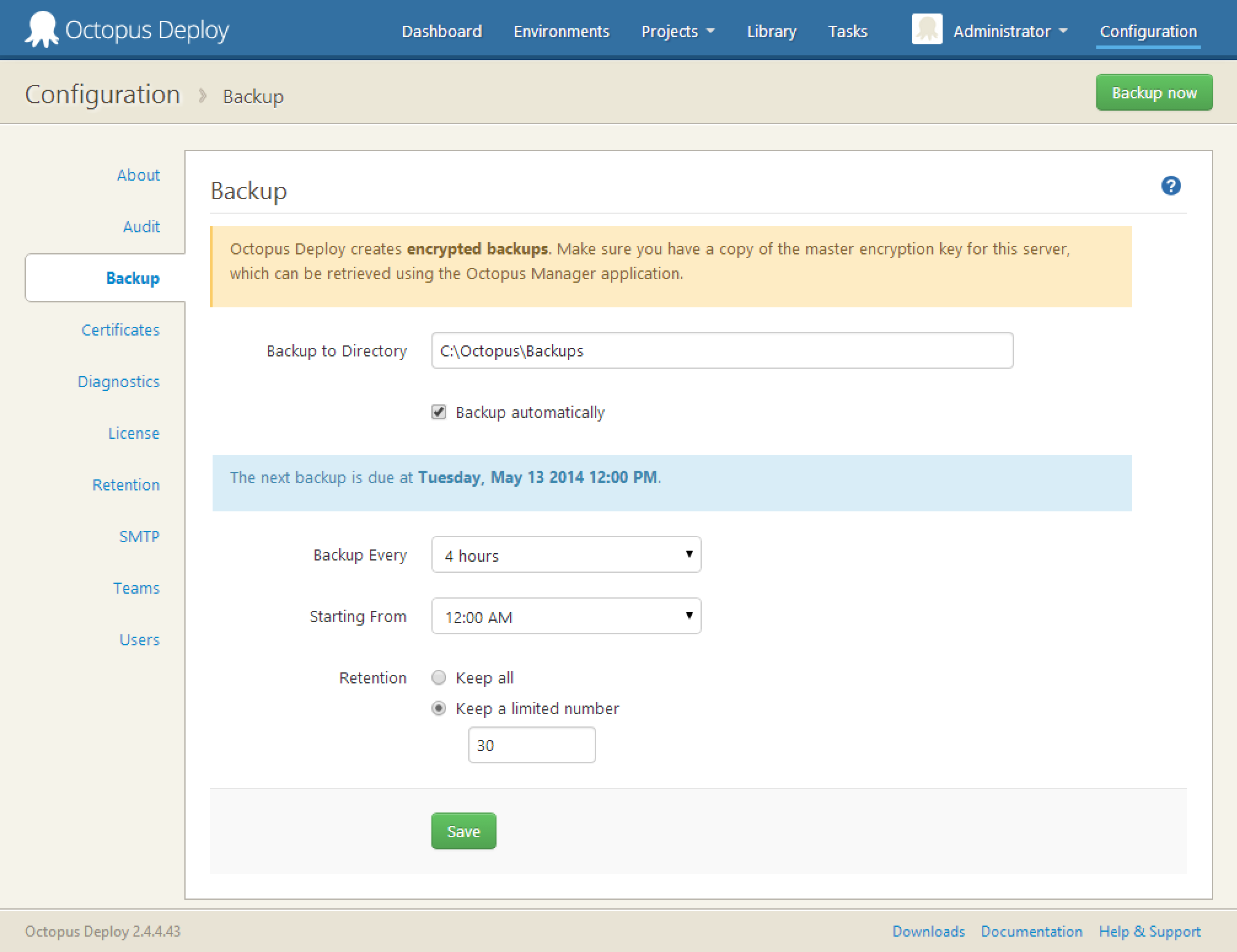 You can take a backup of your Octopus database immediately, simply by clicking the green Backup now button.