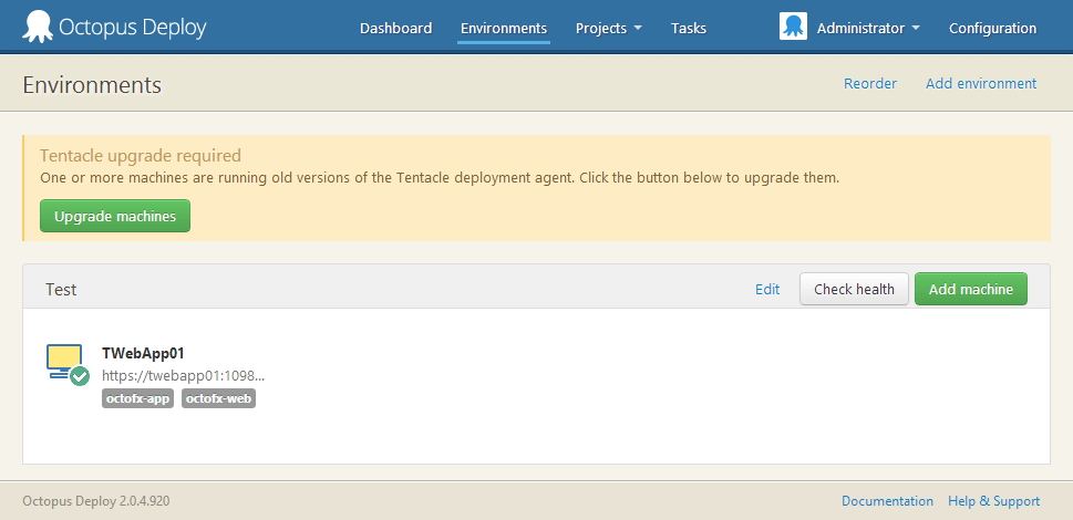 Click on the Upgrade machines button to have Octopus send the new Tentacle package to all of the machines.