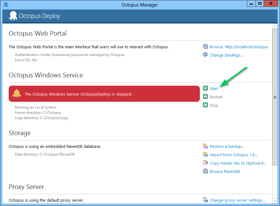 When the installer finishes, Octopus Manager will appear. Make sure the Octopus service is running by clicking Start.
