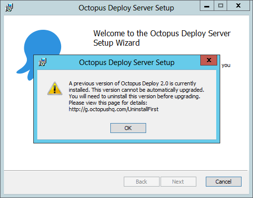 A previous version of Octopus 2.0 is currently installed. This version cannot be automatically upgraded. You will need to uninstall this version before upgrading. Please view this page for details: https://oc.to/UninstallFirst