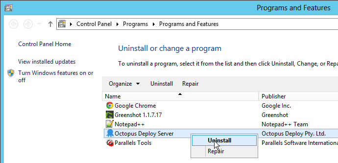 You can uninstall the old version of the Octopus Deploy MSI installer and install the new version by locating the entry in Programs and Features in the Windows Control Panel: