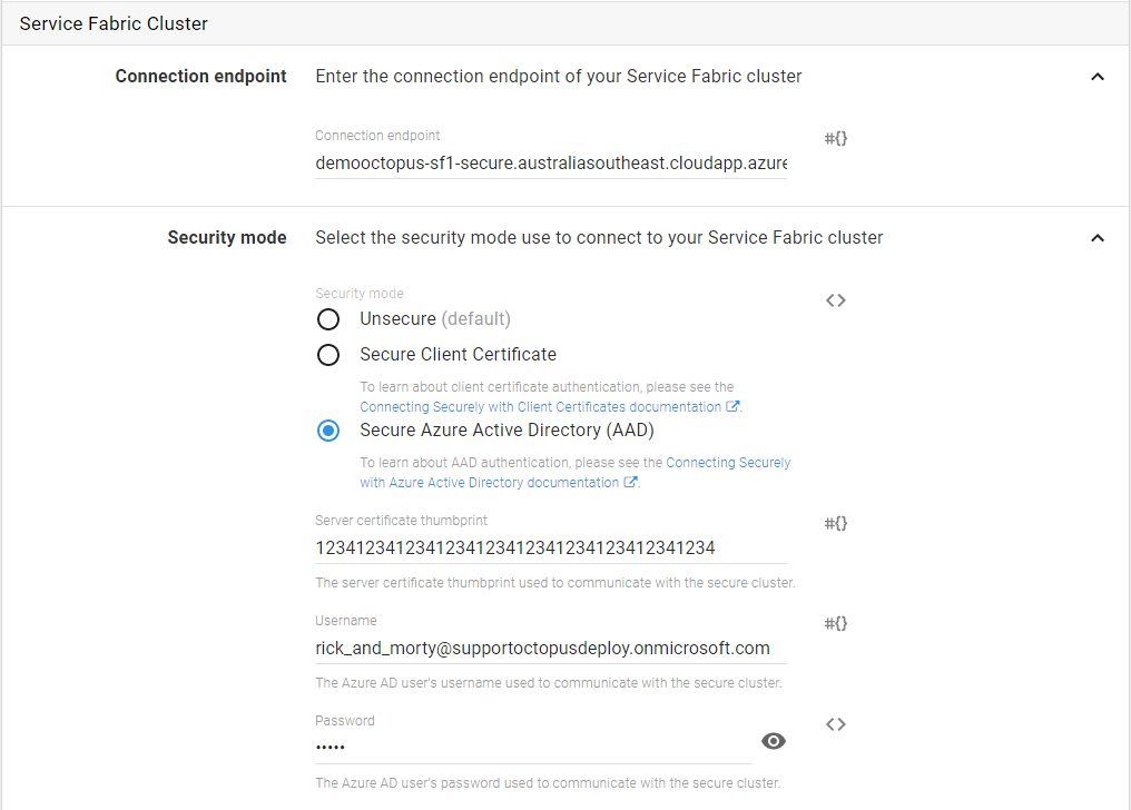 In Octopus, Service Fabric deployment steps that use “Azure Active Directory” as the security mode will need you to enter the username and password of the AAD user who has access to your SF cluster application. Octopus will use these user credentials to obtain an AccessToken that it will then pass as the SecurityToken when connecting to your Service Fabric cluster.