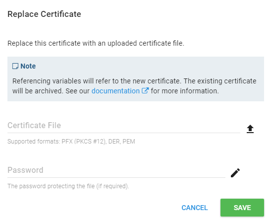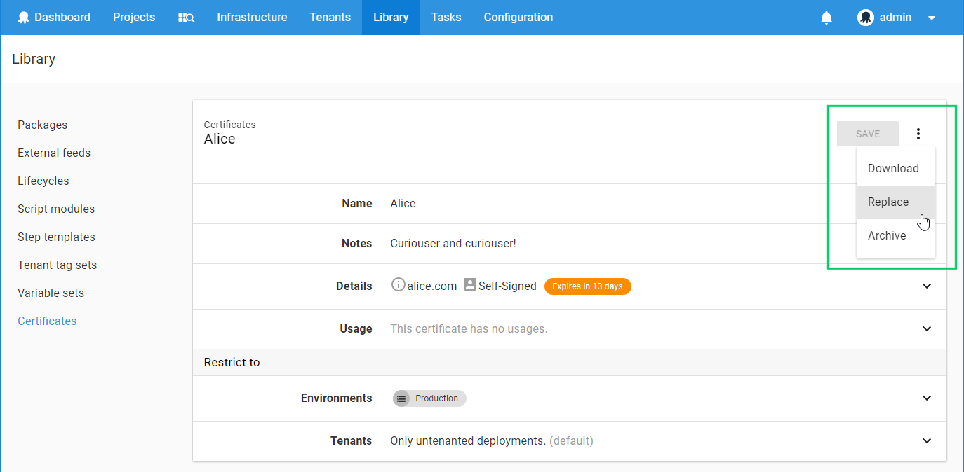 To replace a certificate, navigate to the certificate details page and click ‘Replace’: