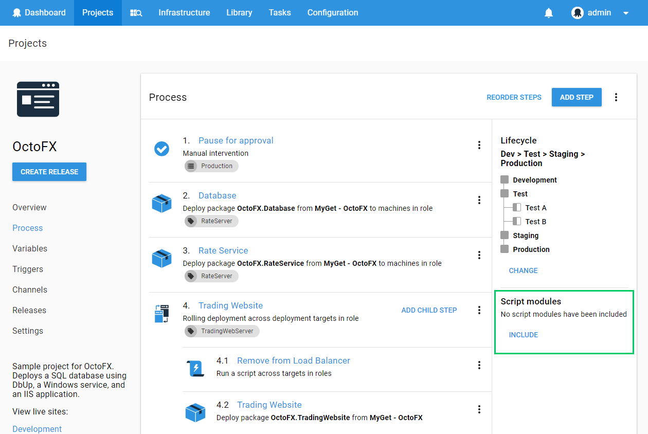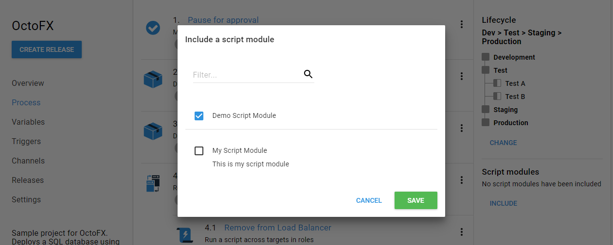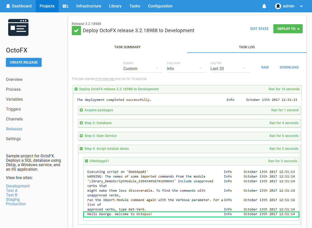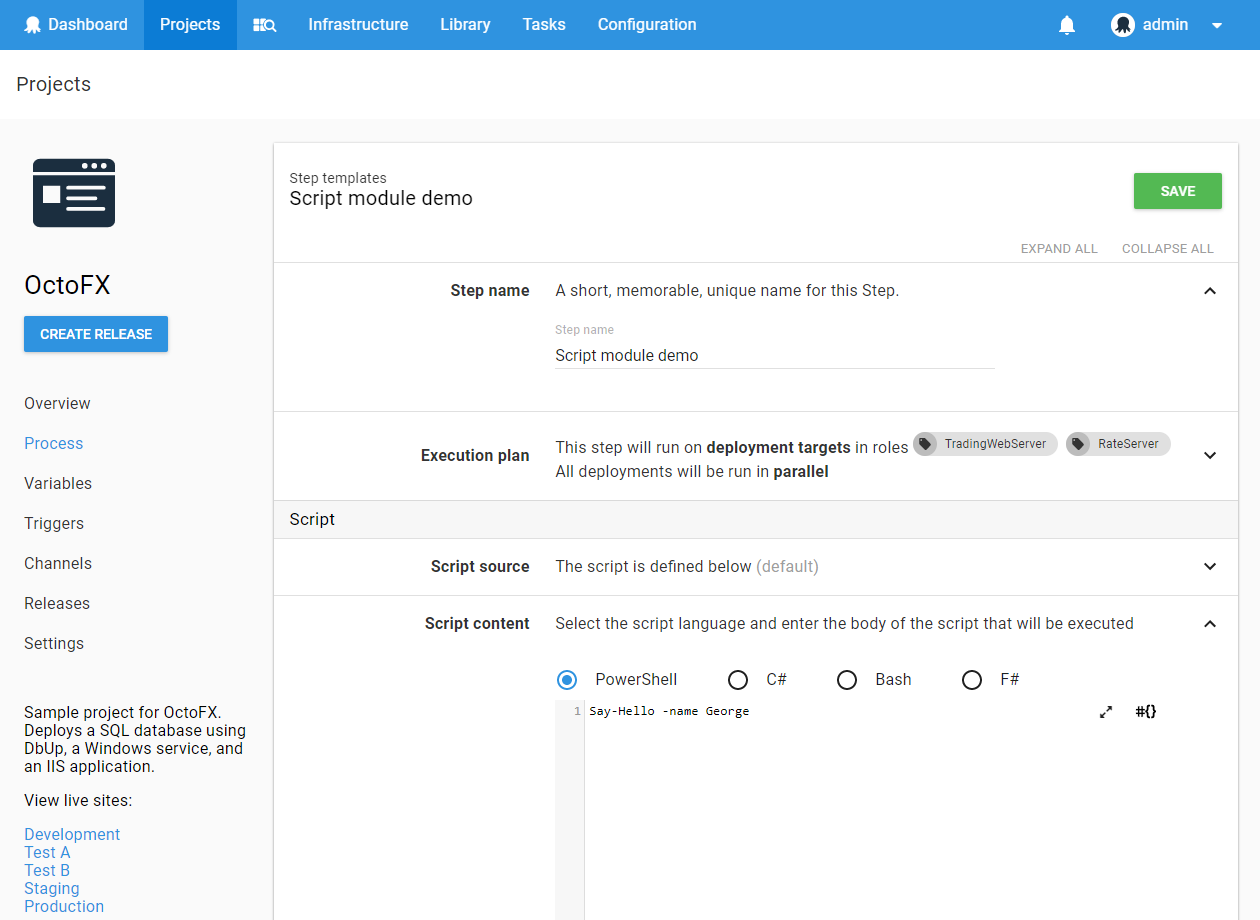 Once you have created a Script Module, you can start using the functions it contains in Script Steps in your deployment processes. These steps must use the same language as the Script Module.