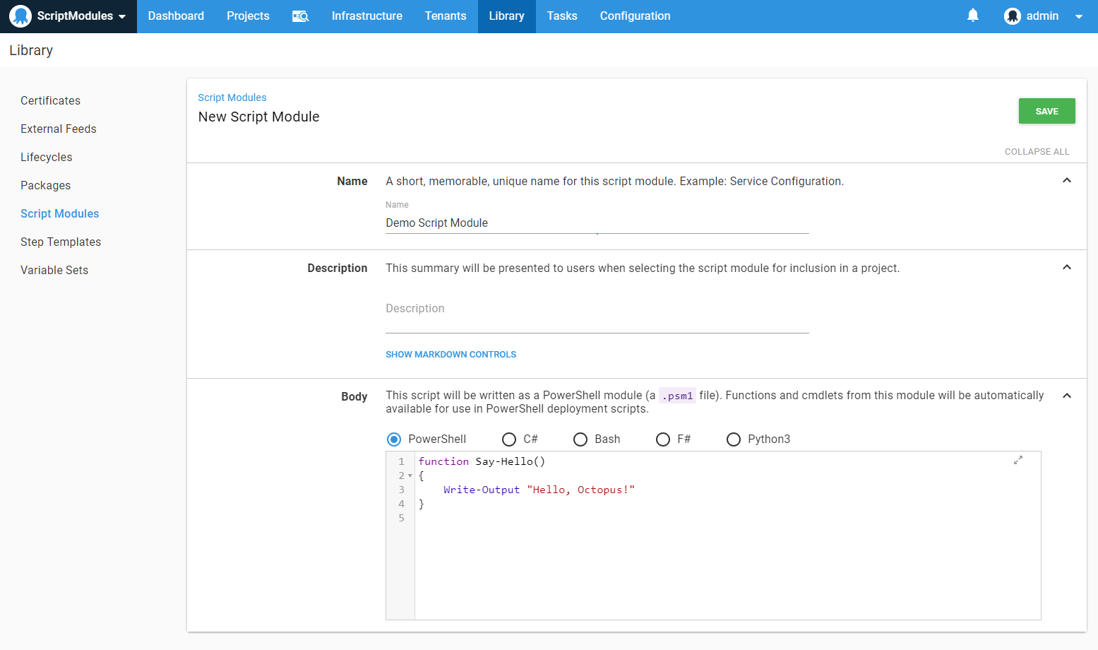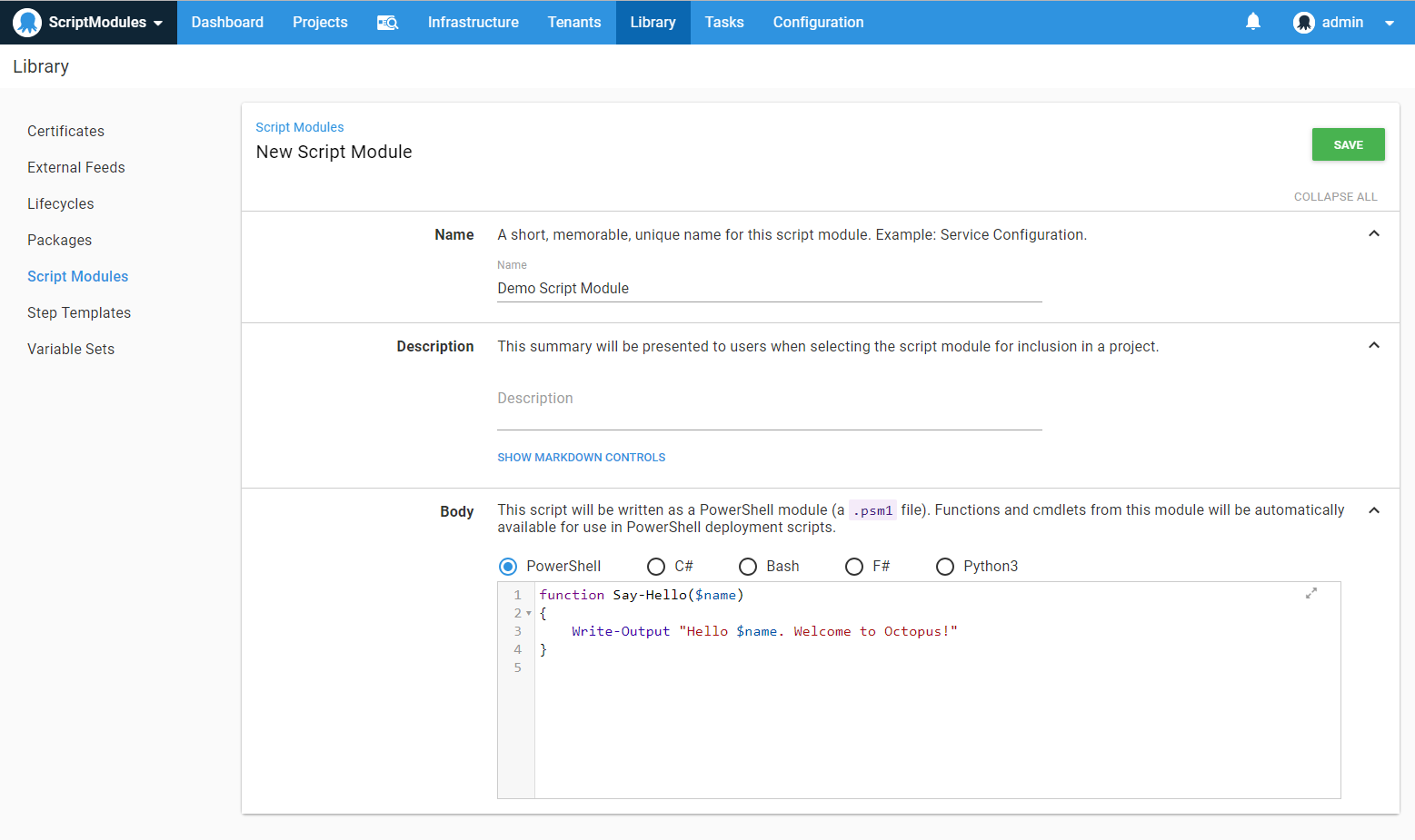 - Your new script module will default to PowerShell and come with a function called Say-Hello. Each supported script language has a similar function. In this walk-through we will work with PowerShell and modify the provided sample function a bit with the following code for the sake of showing a better example: