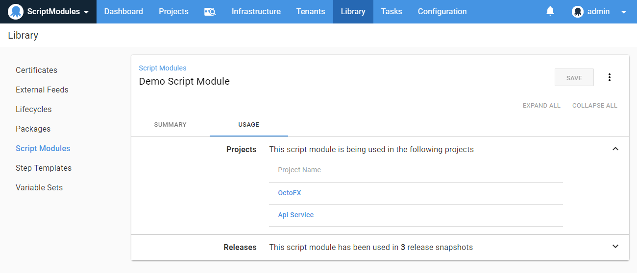 From the Usages tab, you can see where a Script Module is being used. This shows the Projects that are referencing the Script Module, as well as the Releases that have a snapshot of the Script Module. This allows you to assess the ramifications of changing a Script Module, as well as track down where it has been used in the past.