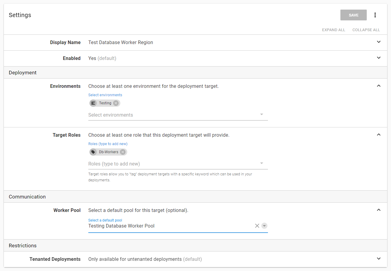 Create a cloud region for each environment. In this example, a new target tag called DbWorker was created for these cloud regions. This will help differentiate these new deployment targets. Make a note of the Worker pool for that cloud region, and select the one that matches your environment of choice: