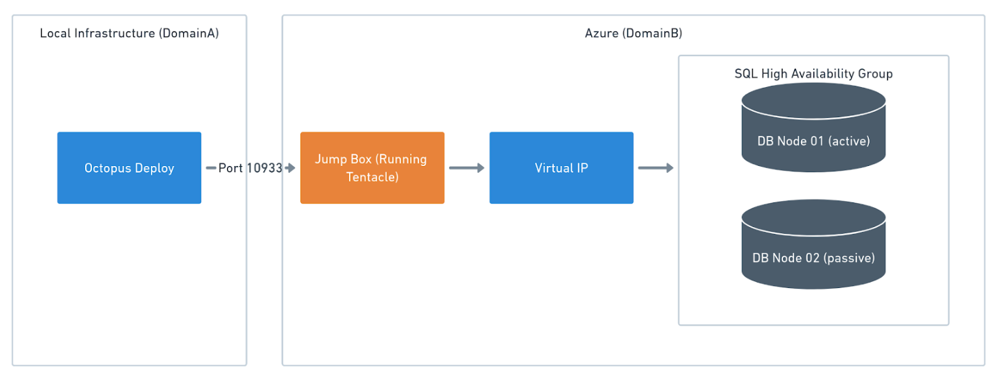 In the event of multiple domains, a jump box is needed per domain. This might be seen where there is a domain in local infrastructure and another domain in a cloud provider such as Azure. As long as port 10933 is open (for a listening Tentacle) or port 443 (for a polling Tentacle) Octopus will be able to communicate to the jump box.