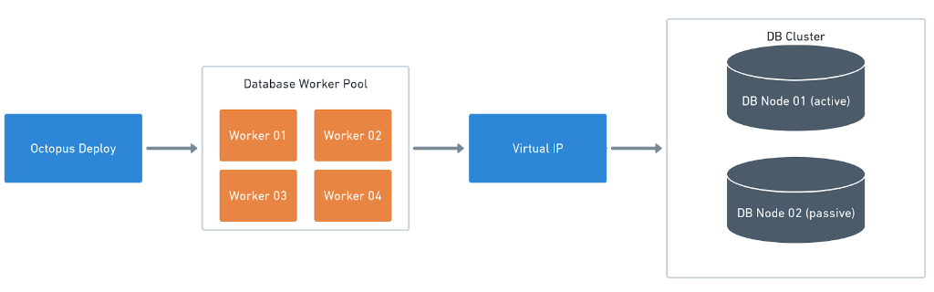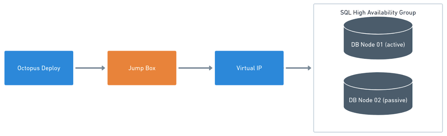 If you are using an older version of Octopus Deploy, or your license limits you to one worker, then you need to install Tentacles on a jump box. The jump box sits between Octopus Deploy and the Database Server VIP. The Tentacle is running as a service account with the necessary permissions to make schema changes. The tooling you chose for database deployments is installed on the jump box: