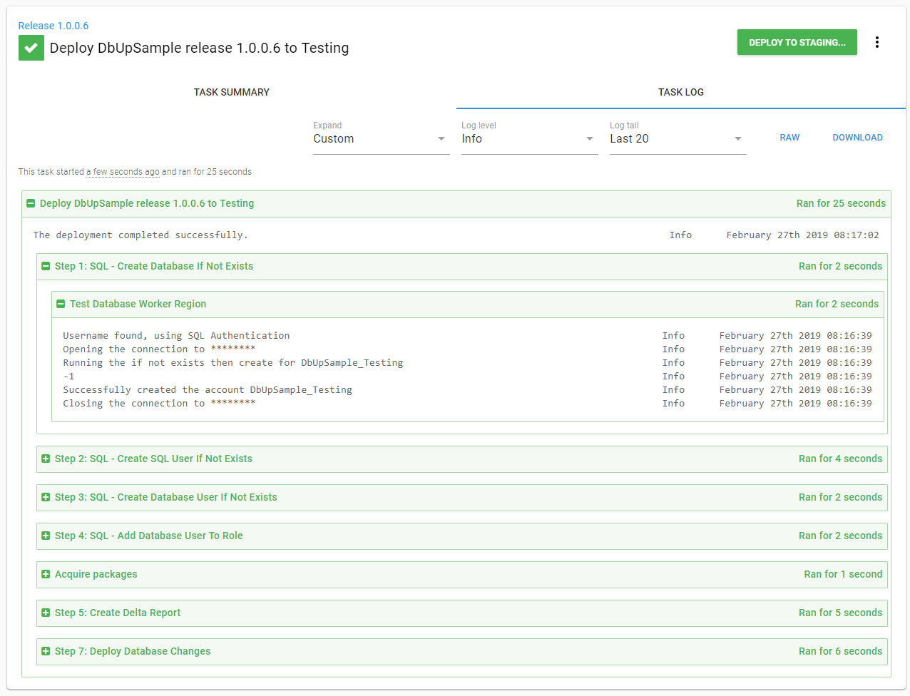 When a release is performed, it will use the environment-specific Worker pool. In the example below, a new release to the Test environment was done using the Test Database Worker Region: