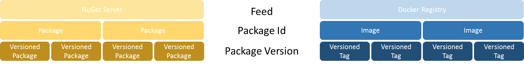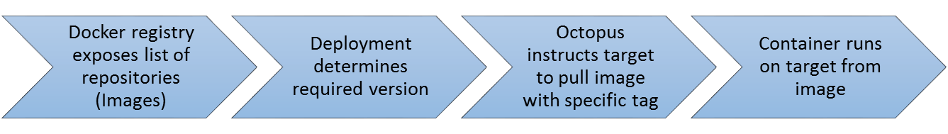 The Octopus concepts of feeds, packages and versions can be mapped to the Docker concepts of registries, images and tags. There is a slight caveat to this similarity since Octopus does not currently intend to self-host a Docker registry in the server, so there is no Docker equivalent of the built-in feed. Also the targets currently need to have access to the repository to pull down images as there is no push process from the Octopus Server.