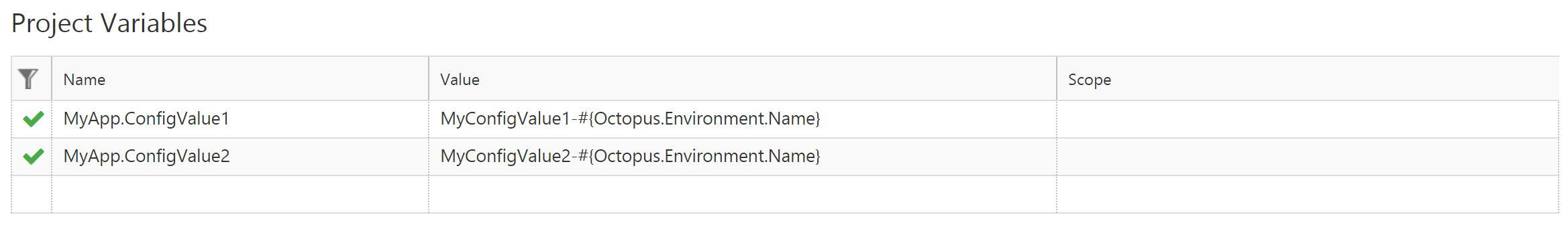 - Configure some project variables to match the JavaScript shown above. You can use these values or any other values you wish - we’ve chosen to show a complex expression including an Octopus System Variable.