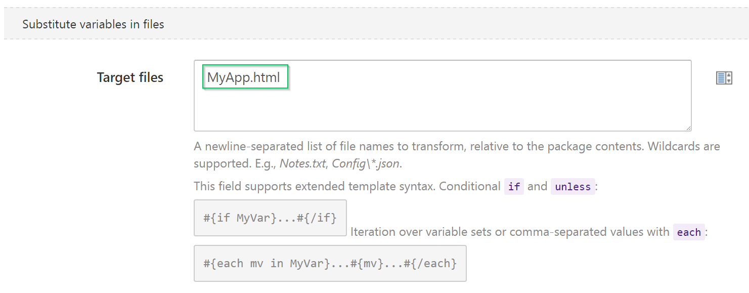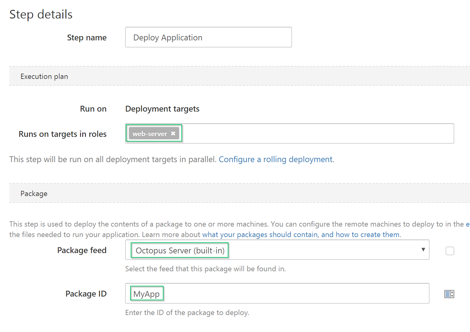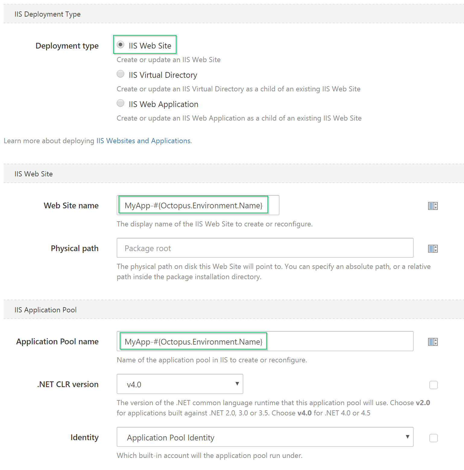 - Configure the deployment process to deploy the MyApp package and host it in an IIS Web Site. Our web servers in this example are associated with the web-server target tag.
