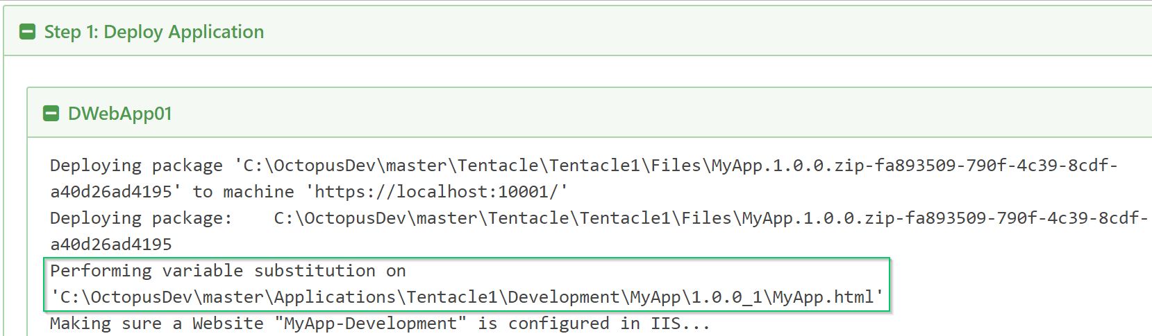 Now when we create a release for this project and deploy it we can see that Octopus has found the MyApp.html file and substituted the variable values into our expressions.