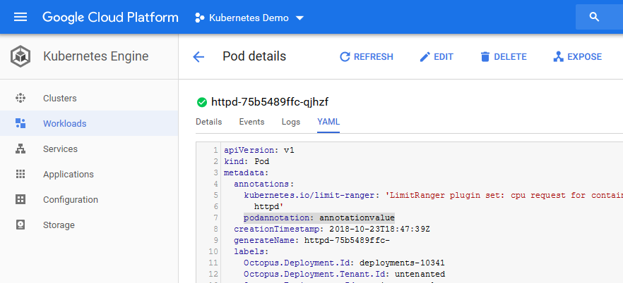 To distinguish between Kubernetes and Octopus terminology, we will reference Kubernetes “resources” e.g. a Deployment resource or Pod resource.