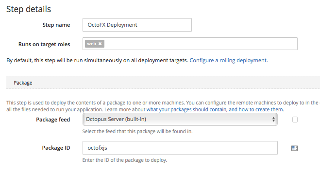 Ensure the target tag matches the target tag that was associated with the machine in the previous step and select octofxjs as the Package ID. This Package ID is derived from the first section of the package that was previously uploaded.