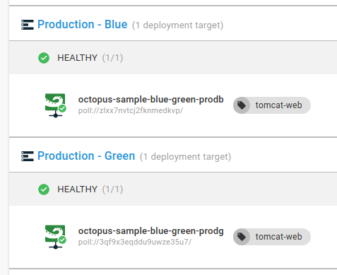 To implement blue-green deployments in Octopus using Environments, create two environments - one for blue, and one for green: