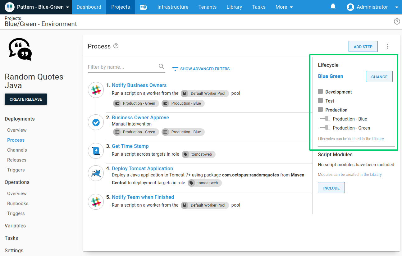 Configuring your lifecycle will need to be done accordingly. Typically you would have both your blue and green environments in a shared “Production/Staging” phase.