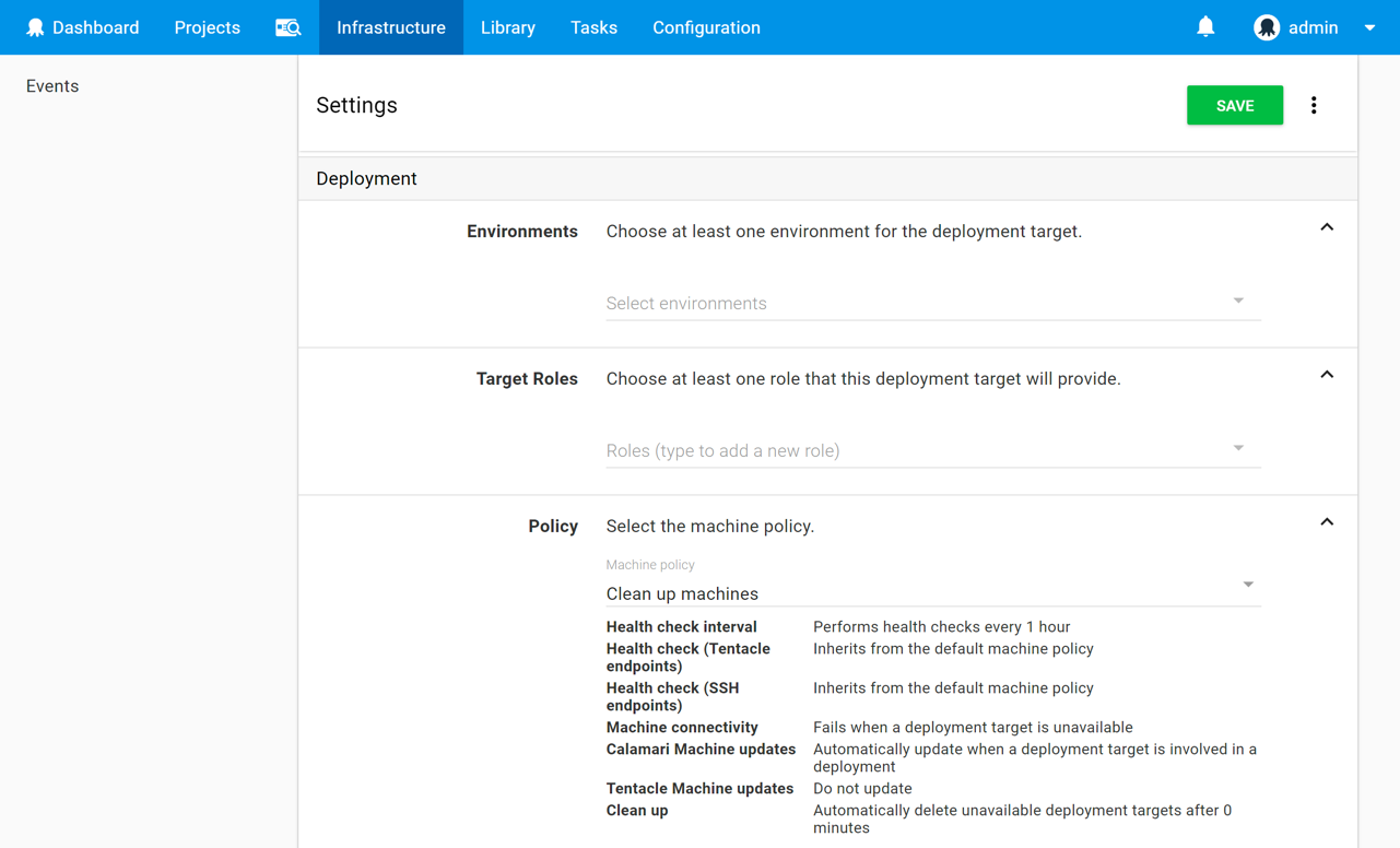 Machine policies are machine related settings that can be applied per-machine. They can be accessed at Infrastructure ➜ Machine policies.