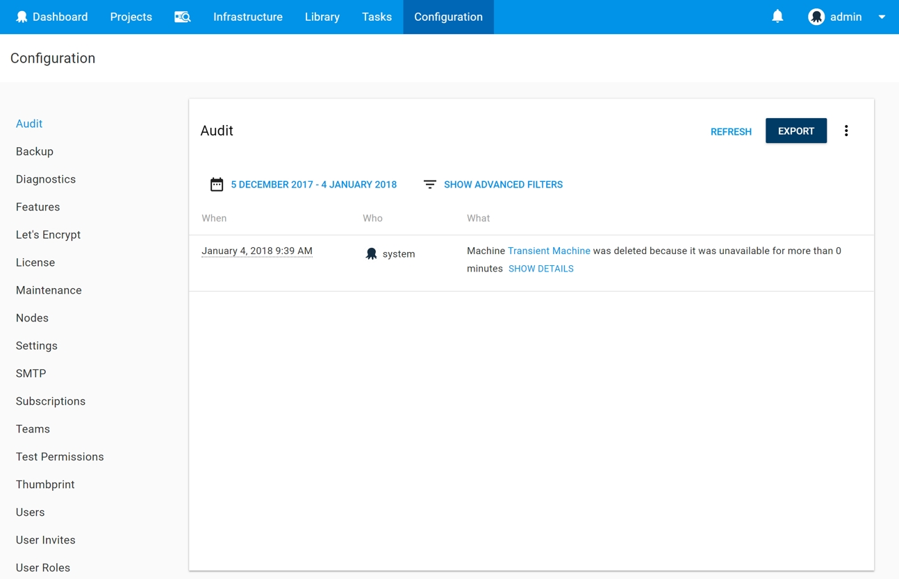 Machine clean up is part of health checks and machine clean up logs are not stored. Machine clean up logging is written to the log of the health check task that performed the deletion. Audit events recording the automatic clean up of machines can be accessed via the Configuration ➜ Diagnostics page by selecting Machine clean up events, which redirects to the audit log of automatic machine removals.
