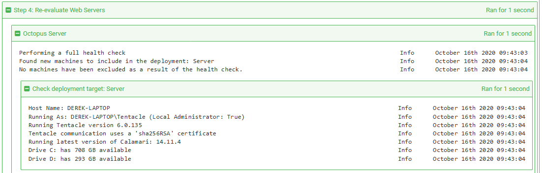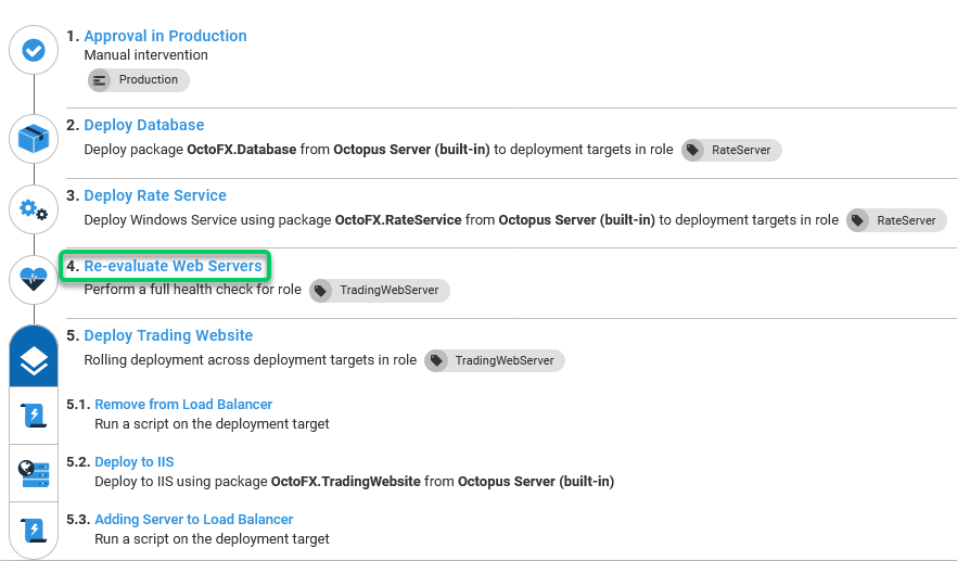 In this example, OctoFX will deploy to RateServer and then run a Health Check step before it deploys to TradingWebServer, ensuring that only currently available targets are involved in the deployment.