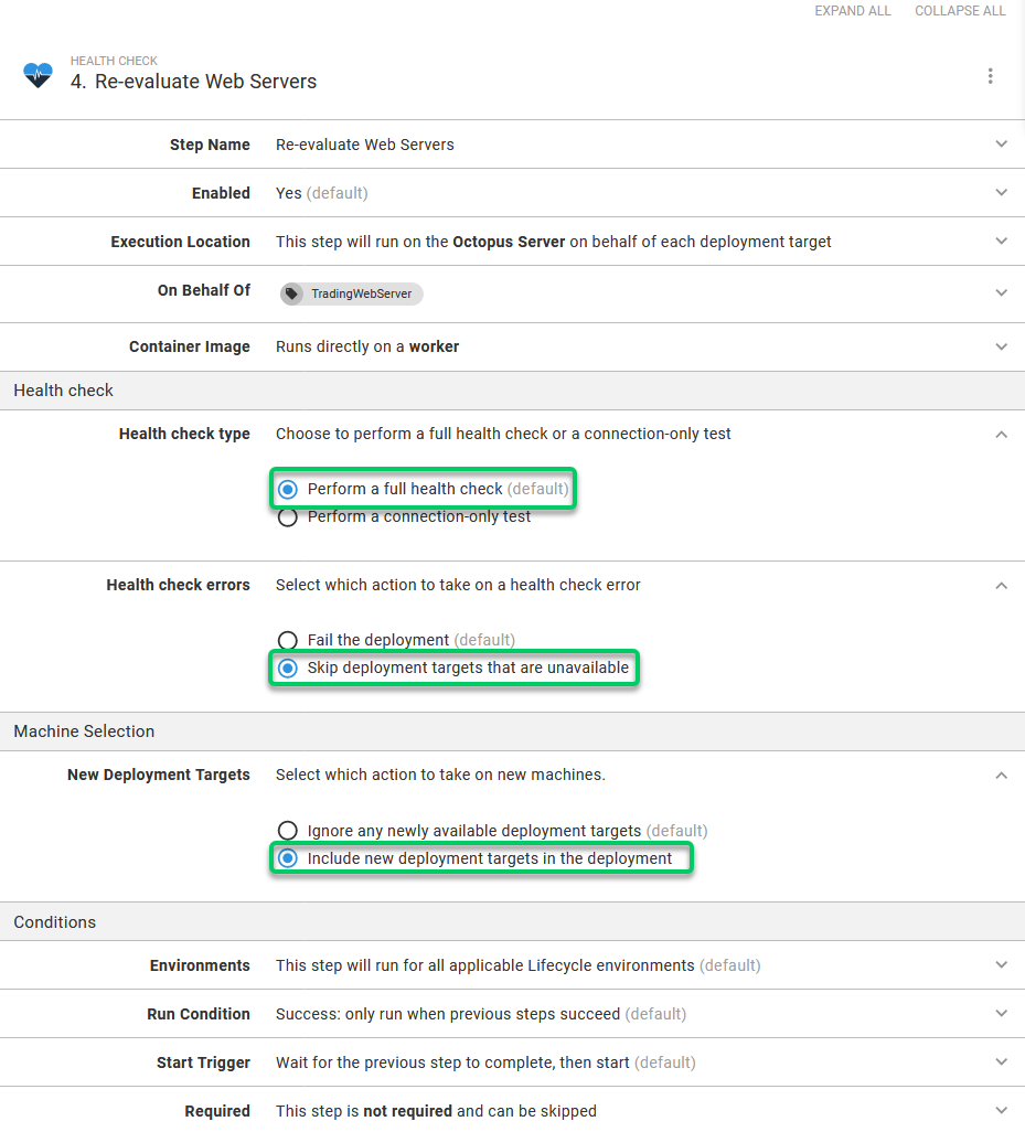 Back at the deployment process, re-order the steps so that the Health Check step occurs before the Trading Website step. This will ensure that deployment targets with the TradingWebServer target tag are re-evaluated before the trading web site is deployed: