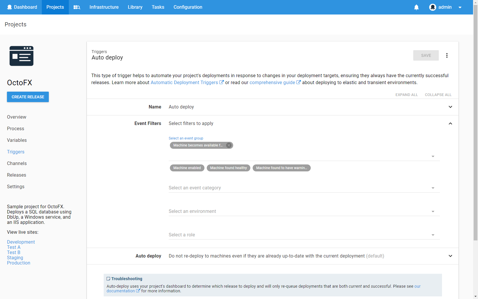 The Hello World project can be configured to automatically deploy when a new deployment target becomes available. Once this has been configured, any Tentacles created when Hello World Infrastructure is deployed will automatically receive the current successful deployment of the Hello World project.