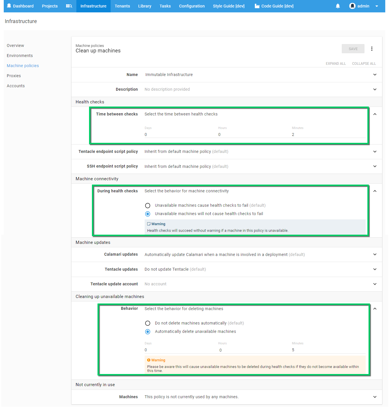 Cleaning up old Tentacles can be accomplished through the use of machine policies. The Immutable Infrastructure machine policy that we created earlier can be edited so that it performs health checks more frequently, doesn’t mind if machines are unavailable during that health check and automatically removes unavailable machines after a period of time. This is perfect for ensuring the Tentacles that we terminate are automatically cleaned up in a timely manner.