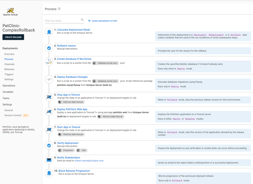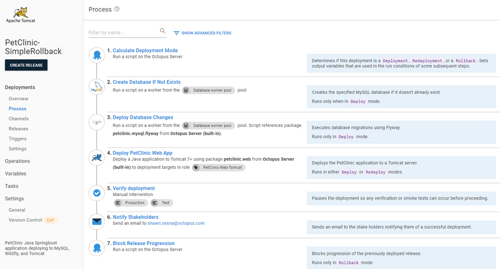 This guide will walk through rolling back a Java application deployed to a Tomcat web server. We will be using the PetClinic Spring Boot example. The PetClinic application consists of two components: