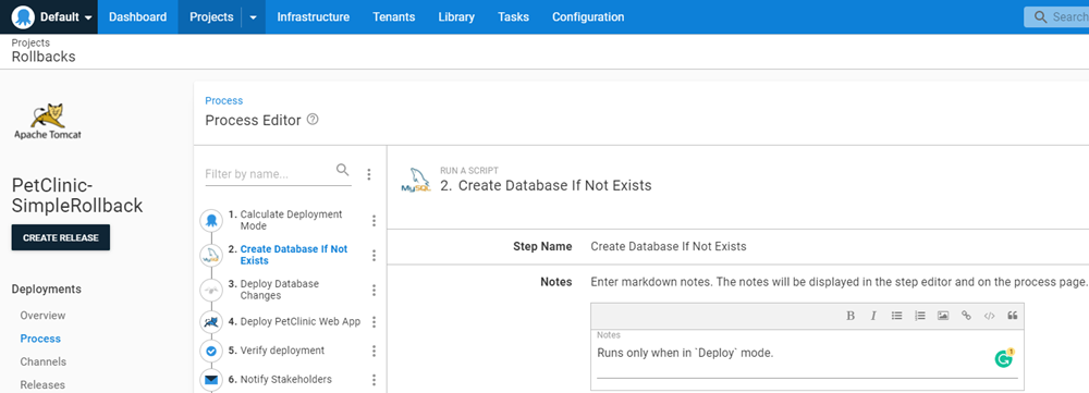 When looking at the deployment process from the Process tab, there isn’t a quick way to determine under which conditions a step will be executed. Using the Notes field for a step is an easy way to provide users information at a glance.