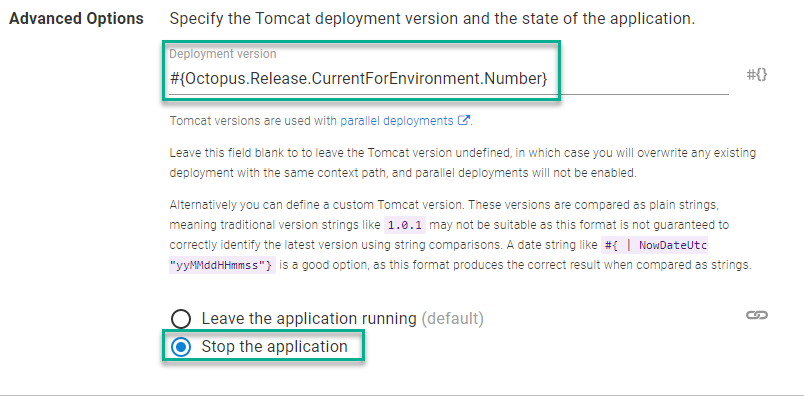 Before we deploy a new version of our application, we first must stop the existing one. The Advanced Options section of the Start/Stop App in Tomcat step is where we specify which version of the application we’re going to stop. For this guide, the version is identified as the previous release number, which is represented by the following variable.