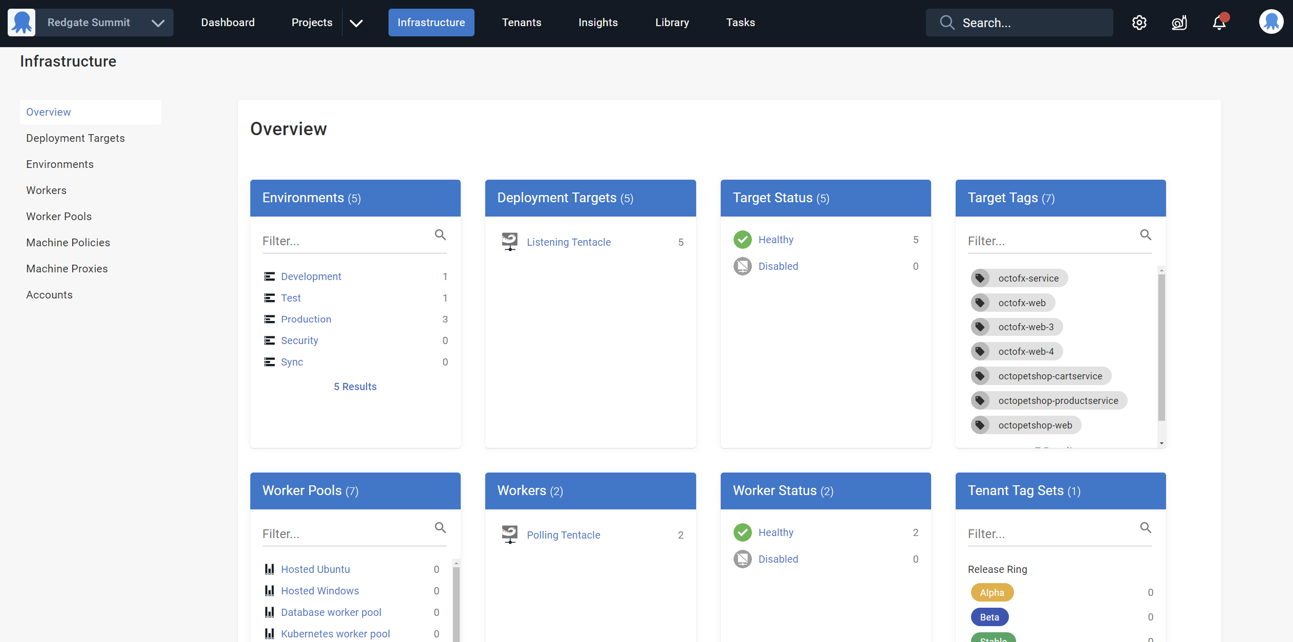 You can manage the machines and services you deploy your software to on the Infrastructure tab of the Octopus Web Portal: