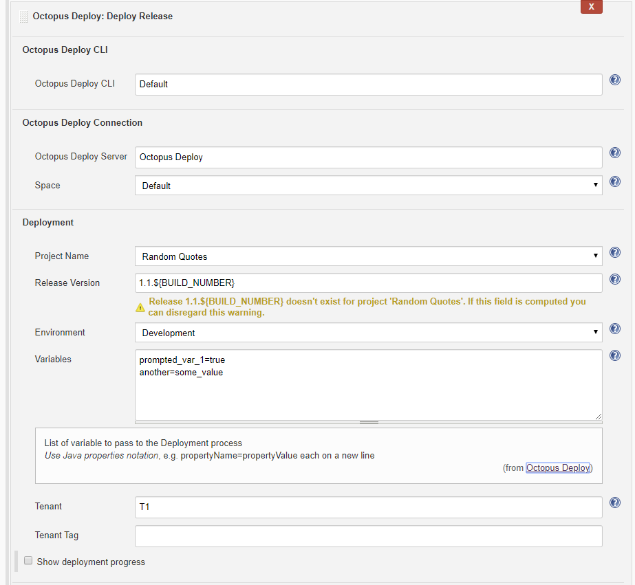 As an example here, we’re relying on the ${BUILD_NUMBER} value generated by Jenkins to use in the Release Version: 1.1.${BUILD_NUMBER}.