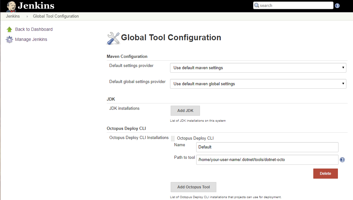 After you have installed the Octopus Deploy plugin. First navigate to Manage Jenkins ➜ Global Tool Configuration to supply the details for the Octopus CLI.