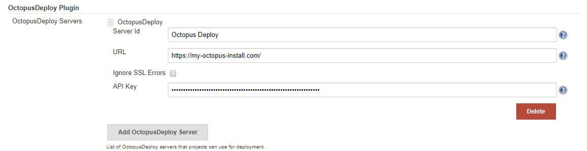 Here you can create the link to your Octopus Server. You can add more than one if your organization uses multiple servers. This is where you supply an API Key, select a Service Account with suitable permission and see how to create an API key for it.