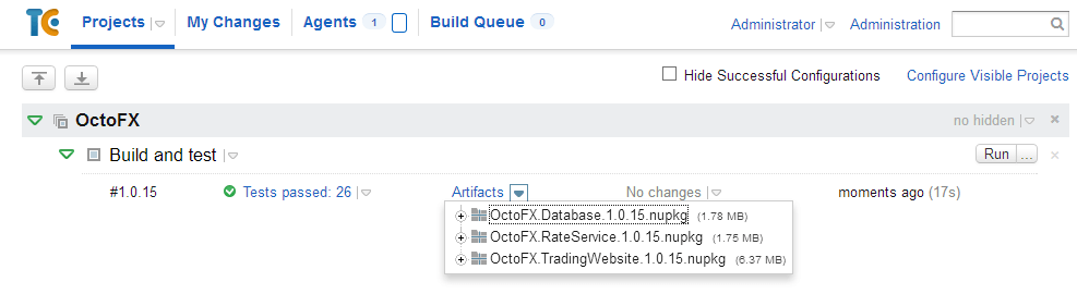 With these options selected, your packages will automatically be created using the version number of the current build. OctoPack will ensure these packages appear in the artifacts tab of TeamCity: