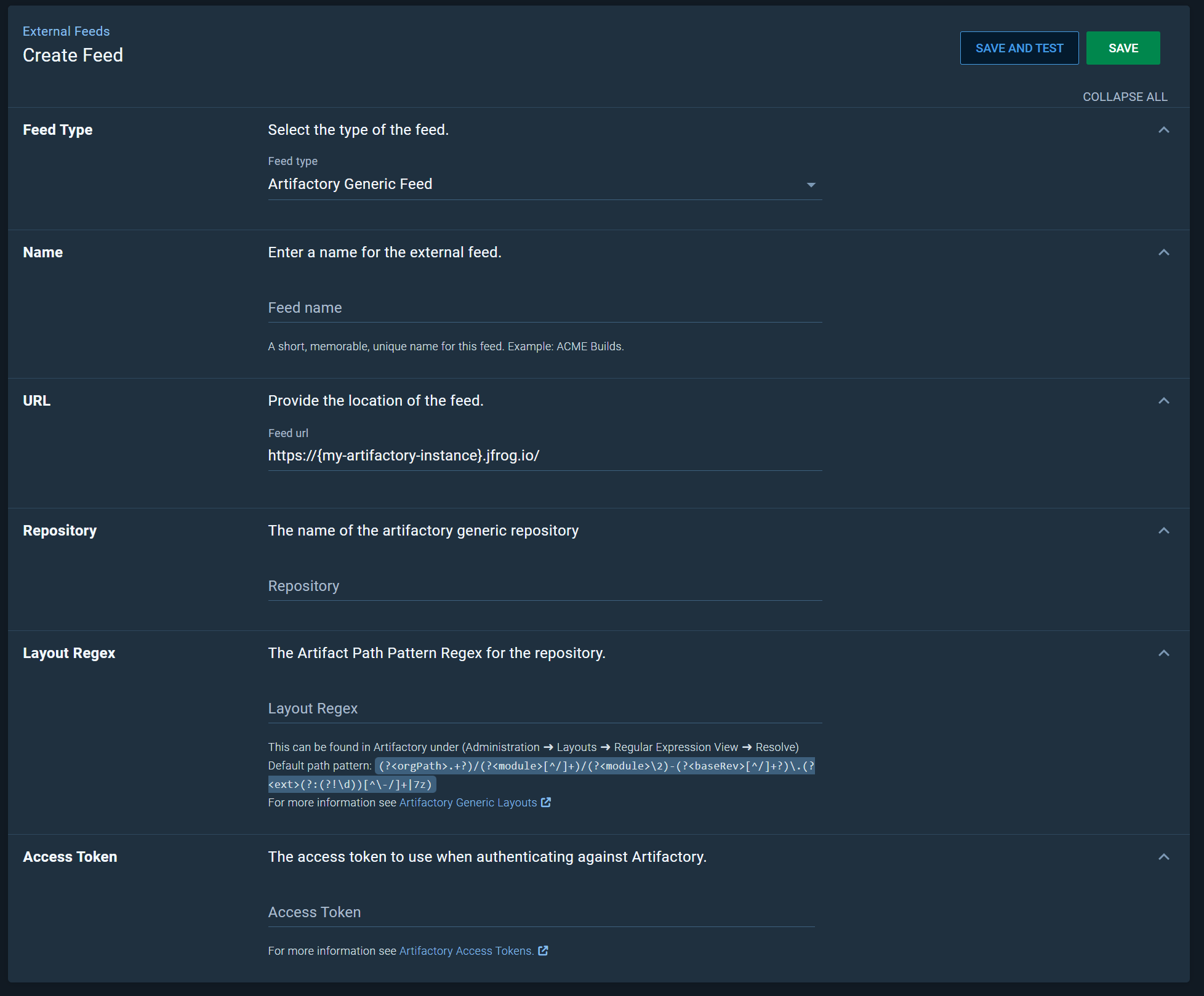 You will then need to provide a feed name, the Artifactory repository name, an access token and the repository Artifact Path regex.