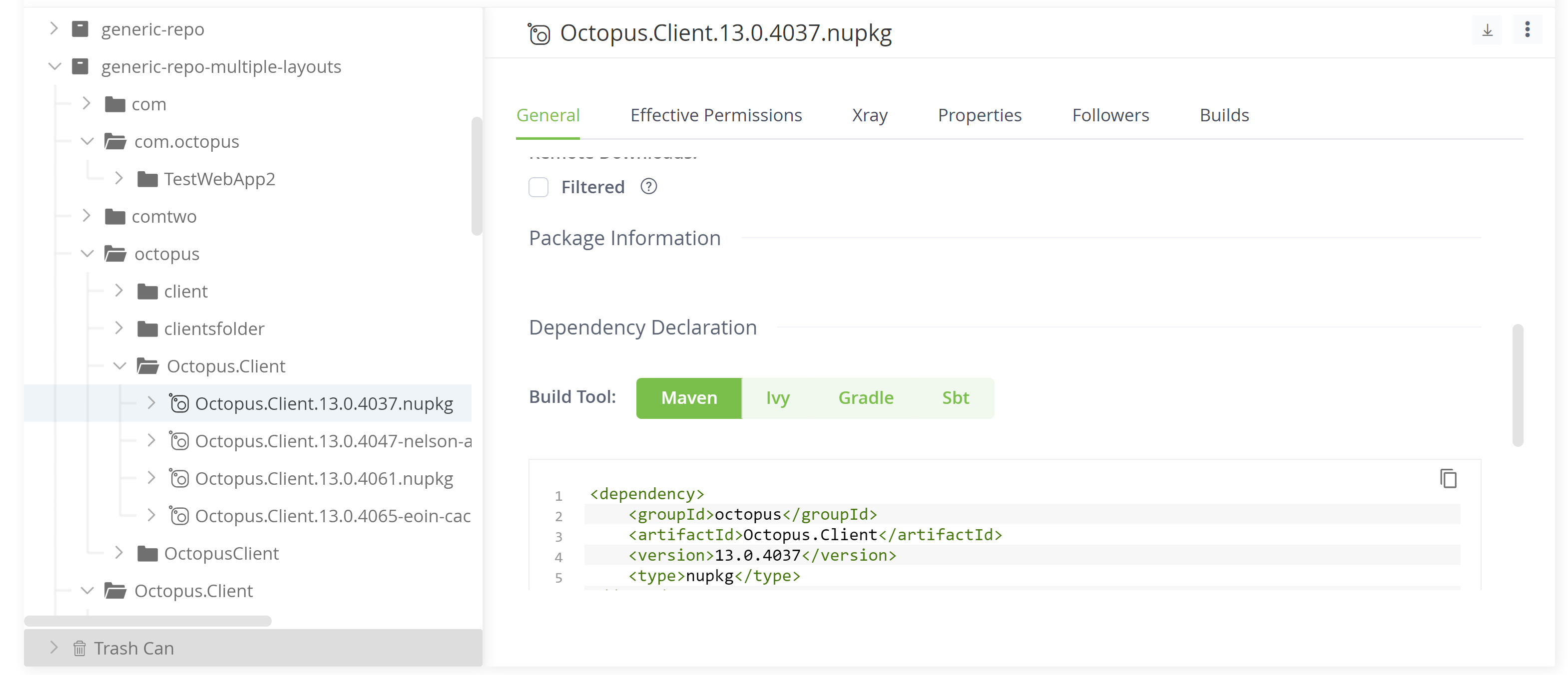 This also provides the package information when viewing an artifacts details in the Artifactory UI. If the package information properties are not visible in the Artifactory UI Octopus will not be able to list versions, or download these artifacts.