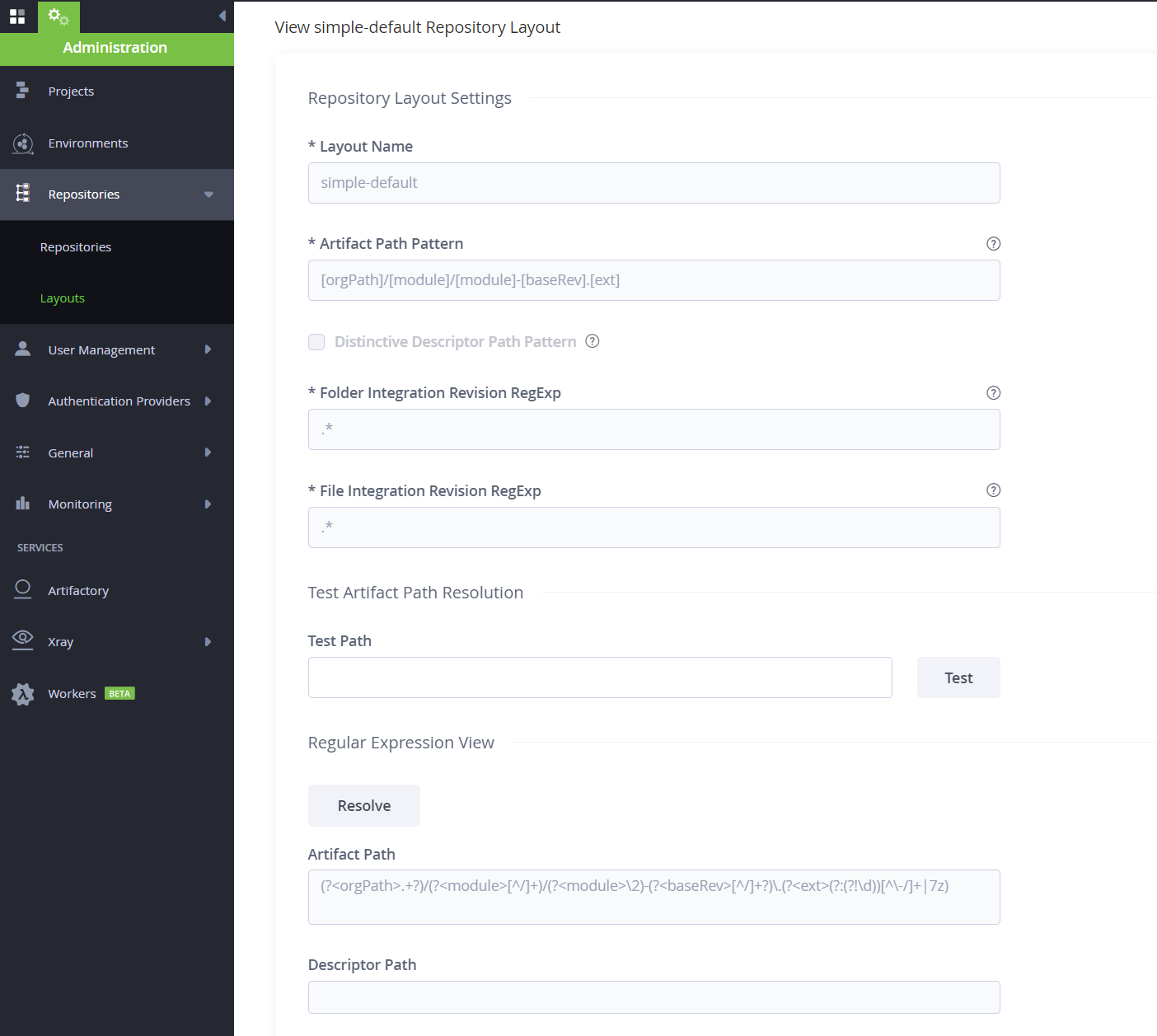 To find the Artifact Path Pattern go to Administration ➜ Layouts ➜ Regular Expression View ➜ Resolve and copy the Artifact Path Regex expression. A new repository will use the default simple-layout generated by Artifactory, the regex for this layout is (?.